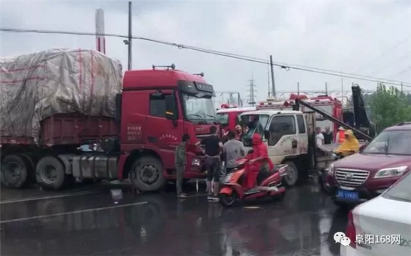 8月17日下午16时许,106国道太和县双浮镇加油站旁一辆大货车与小货车相撞,两车头部不同程度受损,小货车内一人被困。